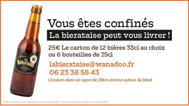 En attendant la fin du confinement et de pouvoir déguster nos plats maisons , vous pouvez acheter notre nouvelle BIERE DE PRINTEMPS et nos autres bières: à BERAT au point vert et au magasin fermier Lafourcade. Autour de Bérat dans les magasins carrefour de Cazeres et Carbonne ,les points verts de Seysses et Plaisance, Cultures…